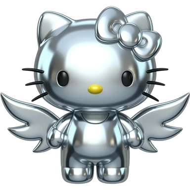 A 3D Y2K-style hello kitty made of liquid chrome and polished silver. Sharp, tribal-inspired wing edges with a high-gloss metallic finish reflections. Minimalist, futuristic, and moody emoji