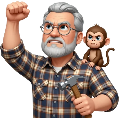 Angry old man wearing a plaid shirt with silver round glasses with with grey hair and no beard or mustache looking at the sky and shaking his fist at the sky with a hammer in his left hand with a angry baby monkey on his shoulder emoji