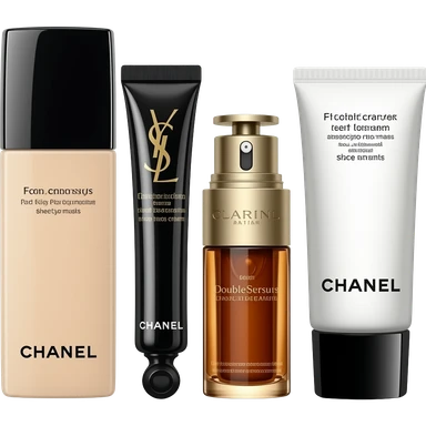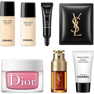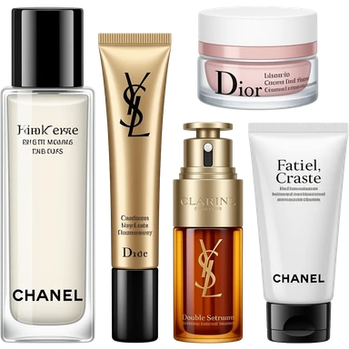 A collection of skincare sets featuring Chanel toner and lotion, YSL eye cream and sheet masks, Dior face cream, Clarins Double Serum, and Chanel facial cleanser emoji