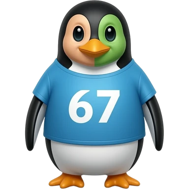 A penguin that has 67 on it and with a human face and alien face and a shirt emoji