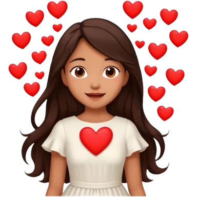 A beautiful girl with long, dark brown hair, fair skin, and a lovely white dress, is overjoyed with love and surrounded by hearts. emoji