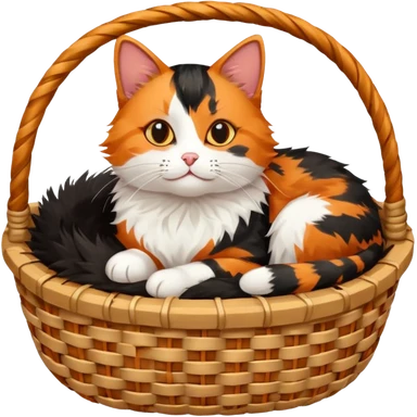 a tricolor cat is lying in a basket emoji