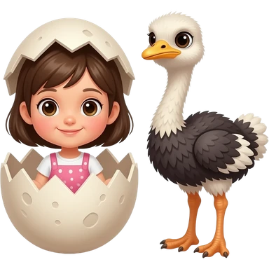 A girl popping out of an ostrich egg which is a dwarf and ostrich is sitting beside emoji
