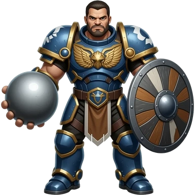 a fearful gaint standing dressed in war outfit holding a huge sphere and big shield in this hand emoji
