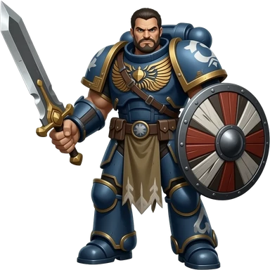 a fearful gaint standing dressed in war outfit holding a huge sword and big shield in this hand emoji