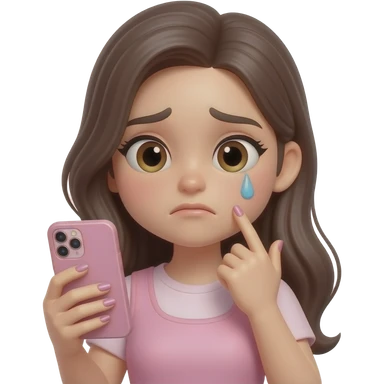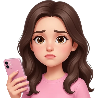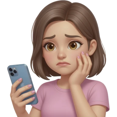 aesthetic emoji girl, slightly stressed expression, holding a smartphone in one hand, distracted, trendy nail art, soft pink and nude tones, minimal makeup, clean background, soft lighting, girly aesthetic, 3D emoji style, high detail emoji