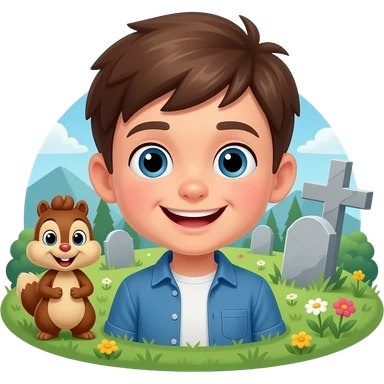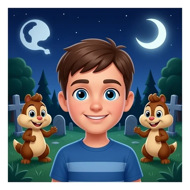A boy doing a grist in front of Alvin from the chipmunks at a graveyard emoji