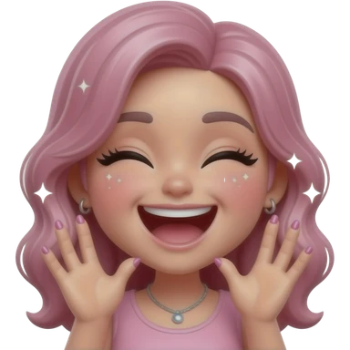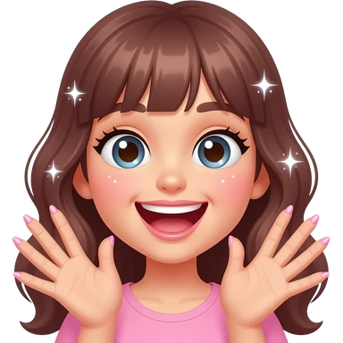 aesthetic emoji girl, talking a lot, open mouth smiling, expressive hands, trendy nail design, soft pink tones, sparkles around, lively energy, soft glam makeup, clean background, girly aesthetic, 3D emoji style, high detail emoji