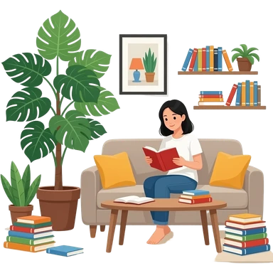 Asian woman is reading a book in the living room that crowded Fiddle Fig and tons of books emoji