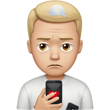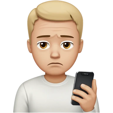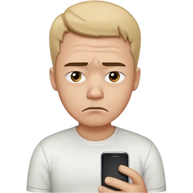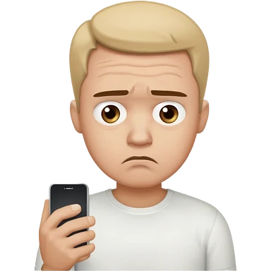 A sad-looking cartoon man holding a smartphone, staring at the screen with worried eyes and a frown, wearing a white shirt. emoji