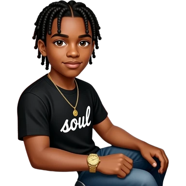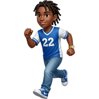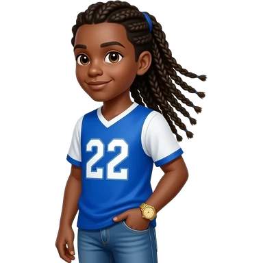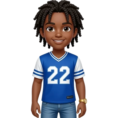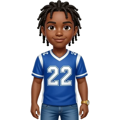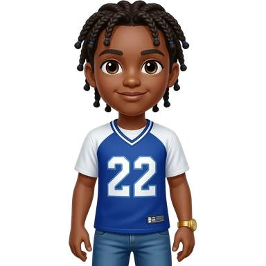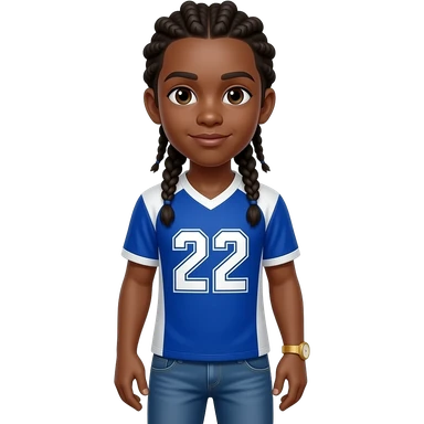 African American teenage boy with cornrow braids to the back wearing a blue and white jersey shirt with 22 on it wearing denim jeans wearing a gold watch emoji
