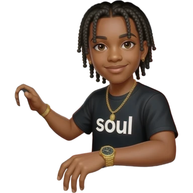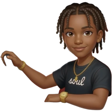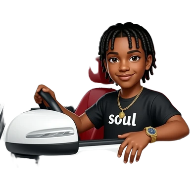 African American teenage boy with cornrow braids wearing a black shirt with the word soul on it wearing a gold watch wearing a gold tennis necklace sitting in a white Mercedes Benz G-Wagon with red interior emoji