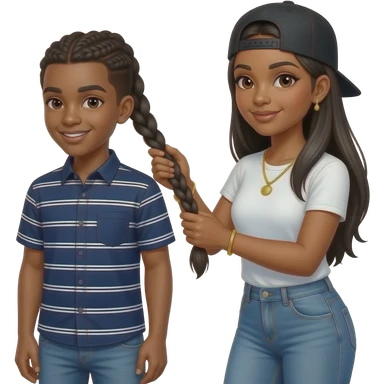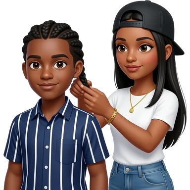 African American teenage boy wearing a navy blue button up shirt with white stripes getting half hair braided by a African American woman with long straight black hair wearing a adjustable black cap to the back and denim jeans wearing a white t shirt and a gold tennis necklace and gold bracelet emoji