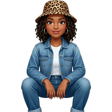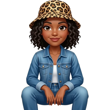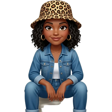 African American woman with shoulder length black curly hair wearing a leopard print bucket hat wearing denim jeans and a denim jacket sitting on porch steps emoji