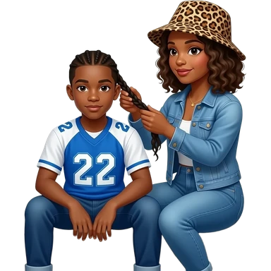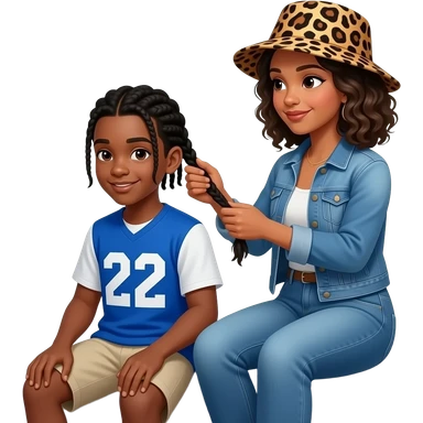 African American teenage boy sitting on porch steps wearing blue and white jersey shirt with 22 on it getting cornrow braided in her by an African American woman with shoulder length curly hair wearing a leopard print bucket hat wearing denim jeans and a denim jacket emoji