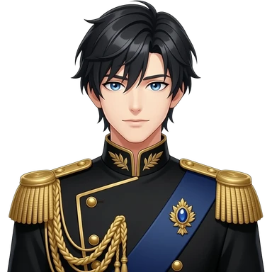 A handsome anime nobleman with jet black layered hair, piercing ocean-blue eyes, pale skin, and sharp aristocratic features, wearing a black and deep navy high-collared military-style uniform with gold embroidery, braided cords, gold-trimmed cuffs, and a gold epaulette with a blue gemstone brooch emoji