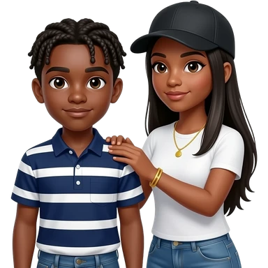 African American teenage boy wearing a navy blue button up shirt with white vertical stripes getting hair braided by a African American woman with long straight black hair wearing a adjustable black cap to the back and denim jeans wearing a white t shirt and a gold tennis necklace and gold bracelet emoji
