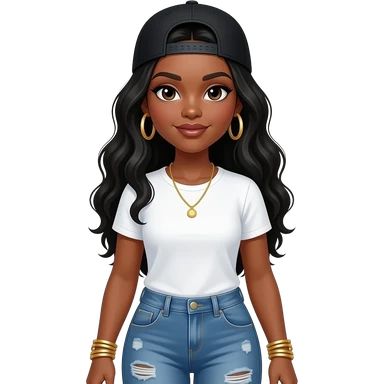 African American woman with long chest length black hair wearing a black adjustable cap to the back wearing a white t shirt wearing gold hoop earrings wearing a gold tennis necklace and a gold bracelet wearing distressed denim jeans emoji