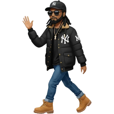 African American man with shoulder length black dreadlocks with black beard wearing black sunglasses wearing a black New York Yankees logo baseball cap wearing a black bubble winter coat with denim skinny jeans and timberland boots walking with hand up emoji