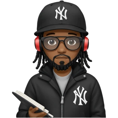 African American man with shoulder length black dreadlocks with black beard wearing black sunglasses wearing a black New York Yankees logo baseball cap wearing a black bubble winter coat wearing headphones writing a rap song in notebook emoji