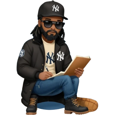 African American man with shoulder length black dreadlocks with black beard wearing black sunglasses wearing a black New York Yankees logo baseball cap wearing a black bubble winter coat wearing denim skinny jeans timberland boots writing a note emoji