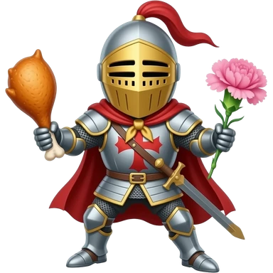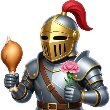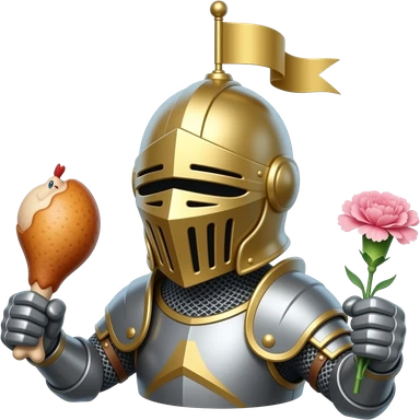 a gold medieval knight holding a chicken leg and a pink carnation emoji