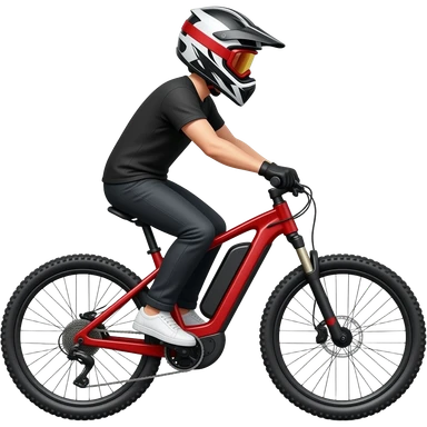 A powerful ebike that has a red frame and no pedals with a guy riding it with white shoes black pants black t shirt black gloves and a dirtbike helmet with red googles emoji