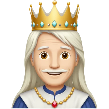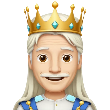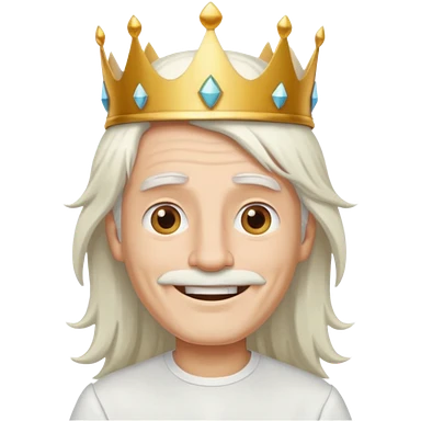 a smiling man with long white hair and has no beard wearing a white smart shirt and a crown emoji