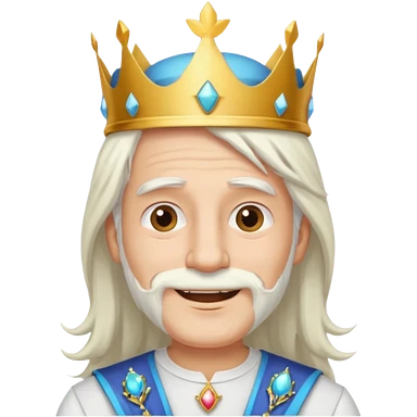 a smiling old man with long white hair and has no beard wearing a white smart shirt and a crown emoji