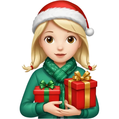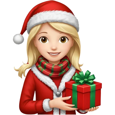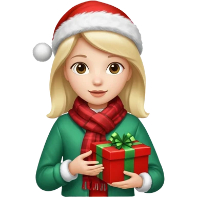 a girl wearing a chirstmas jacket and scarf and holding a christmas gift emoji