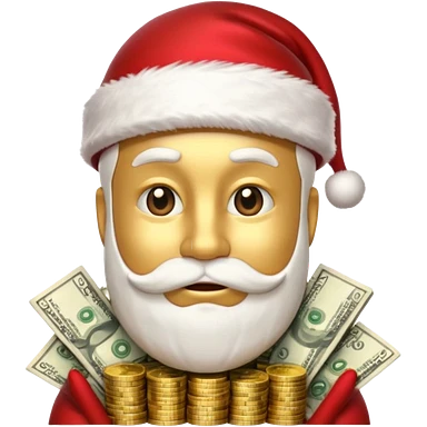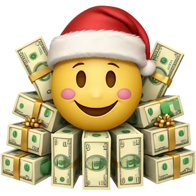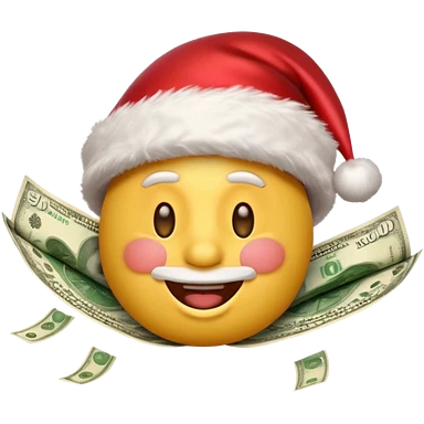 A festive 3D emoji style yellow smiley face wearing a Santa hat, surrounded by stacks of cash and dollar bills, joyful expression, Christmas and New Year theme, high quality, clean design, studio lighting, no text, no background, isolated object, transparent background, emojis.com style emoji