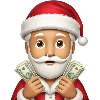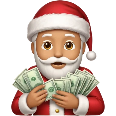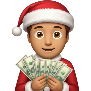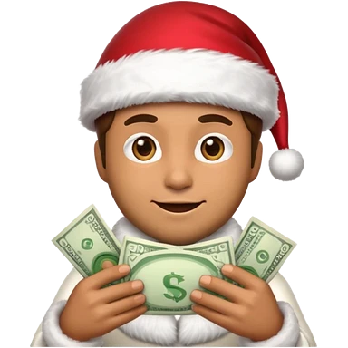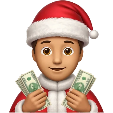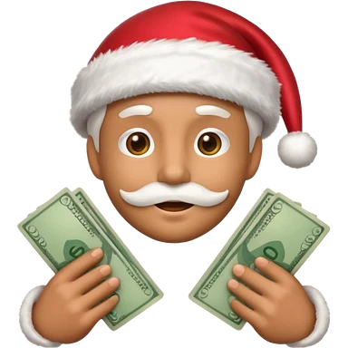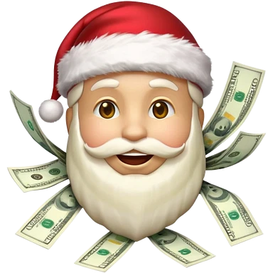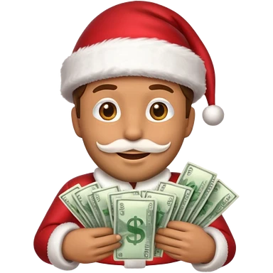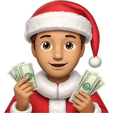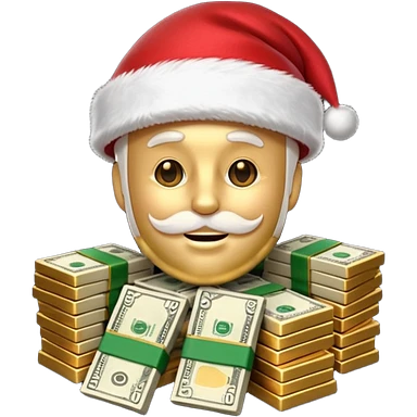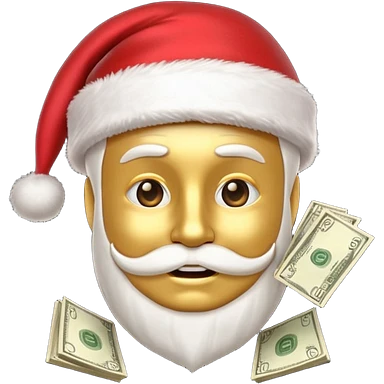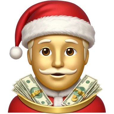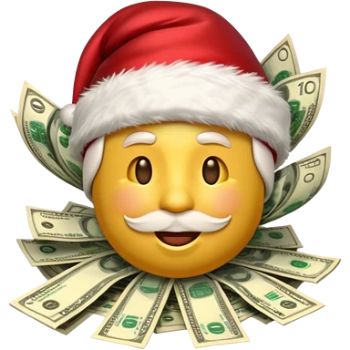 A rich happy emoji face in Santa hat, covered in money, cash stacks and flying dollar bills, Christmas mood, New Year festive style, glossy 3D emoji, vibrant colors, high detail, no text, isolated, transparent background emoji