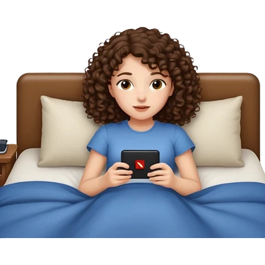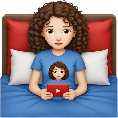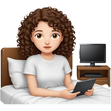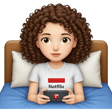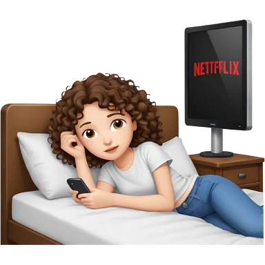 A girl, brunette with curly hair down to her shoulders, watching TV. Have her lie down on the bed, and put on Netflix on the TV. emoji