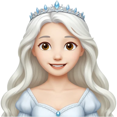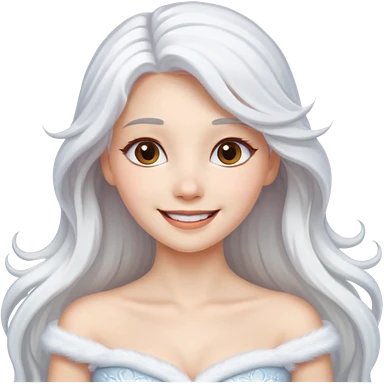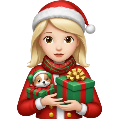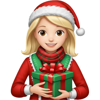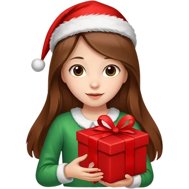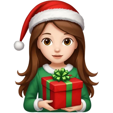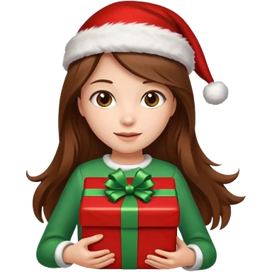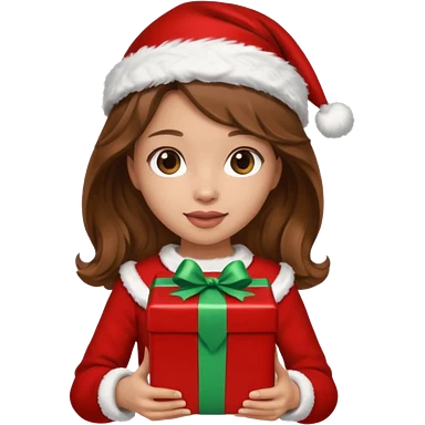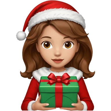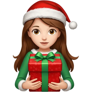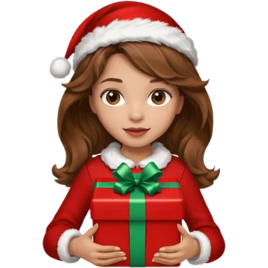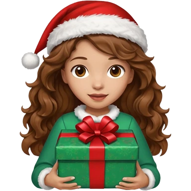 a girl with wavy brown hair wearing a christmas clothes and holding a gift emoji