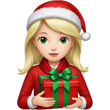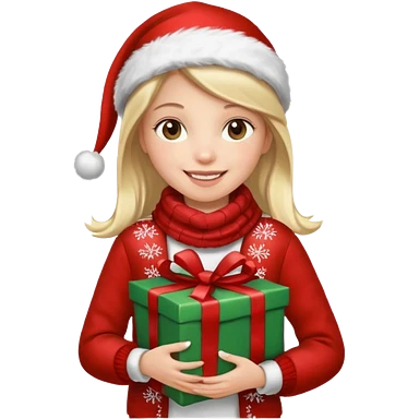 a girl with long brown hair wearing a christmas clothes and holding a gift emoji