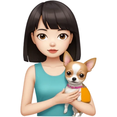 a pretty Asian girl, with hair bangs, pale skin, with manicure holding a chihuahua in her, with the attuidute of whatever" emoji
