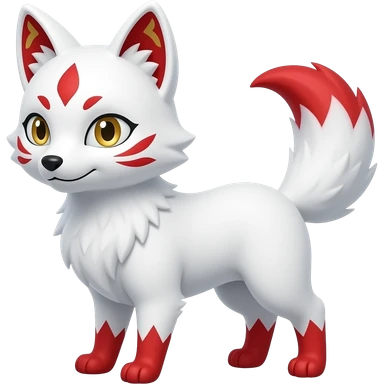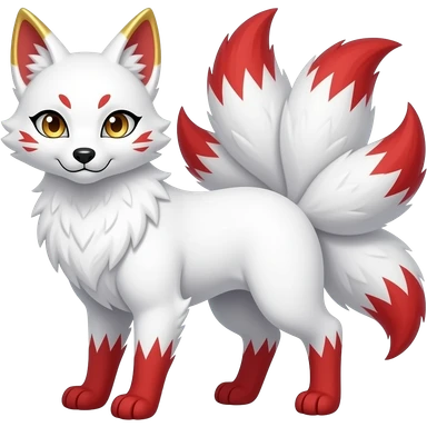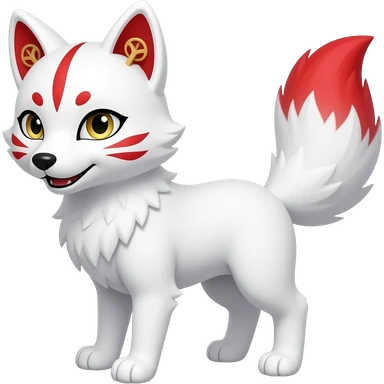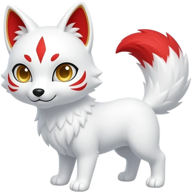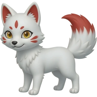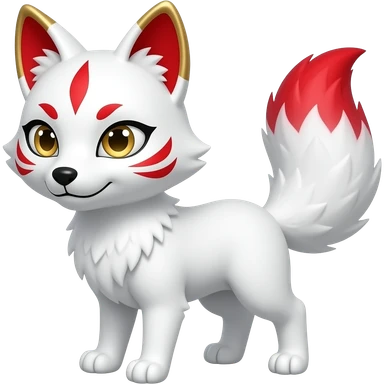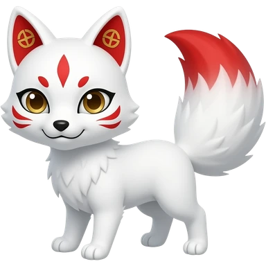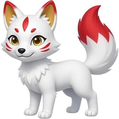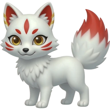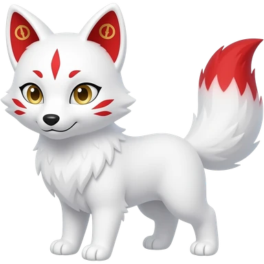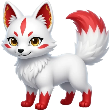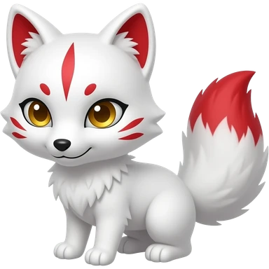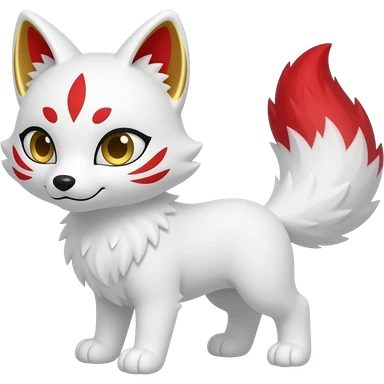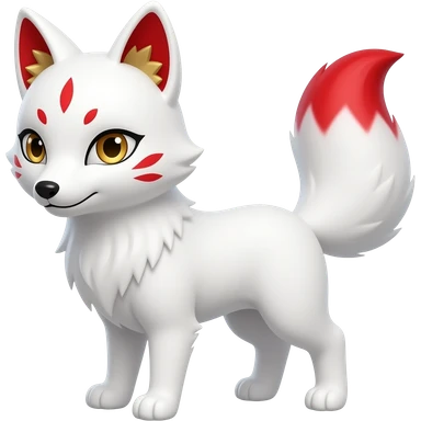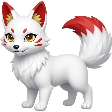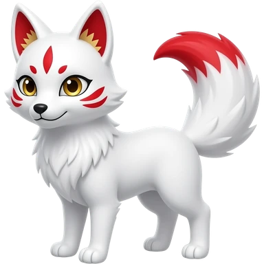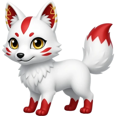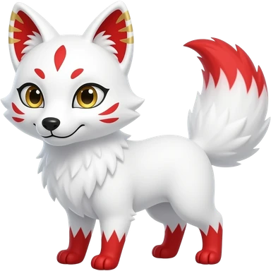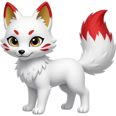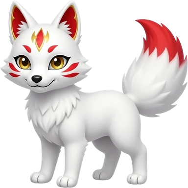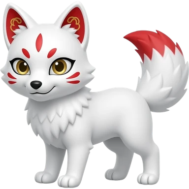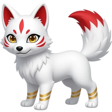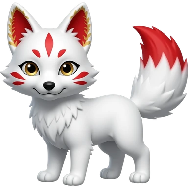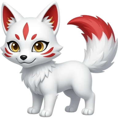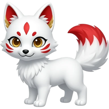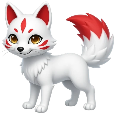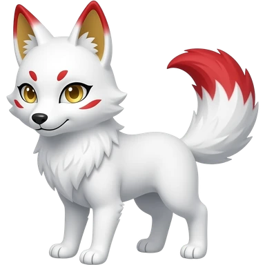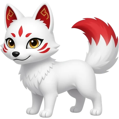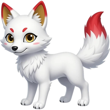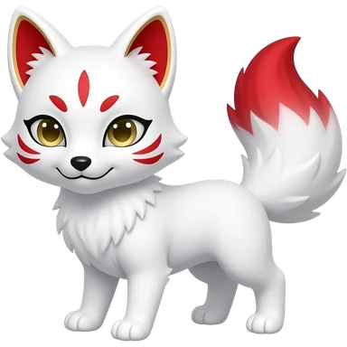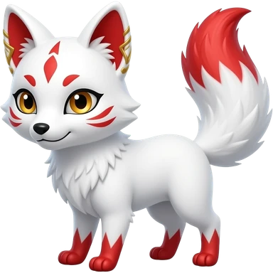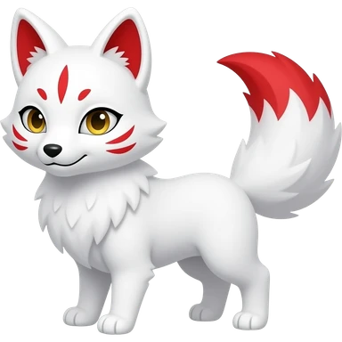 A white one-tailed Kitsune (Fox Form,) with red accents on his face, (two on each cheek and a single one on his forehead,) red on the inside of his ears, and pale golden eyes. Pure white paws,and a red tail tip. emoji