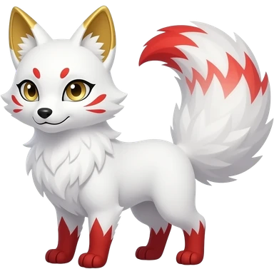 A white one-tailed Kitsune (Fox Form,) with red accents, gold accents inside of his ears and pale golden eyes. Pure white paws, and a red tail tip. emoji