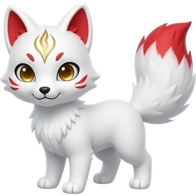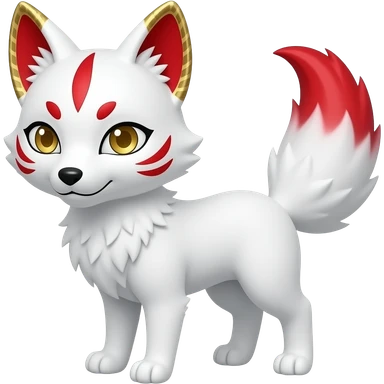A pure white one-tailed kitsune (fox form,) with red accents, (one marking on each of its cheek, two markings each across its eyes and a single one on its forehead,) red on the insides of its ears, with gold symbols inside of its ears,) and pale golden eyes. Pure white paws and a red tail tip. emoji