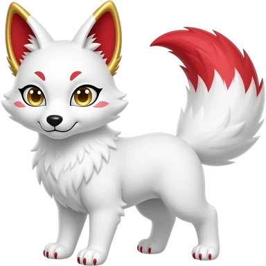 A white one-tailed Kitsune (Fox Form,) with red accents on his face, red and gold inside of his ears and pale golden eyes. Pure white paws, and a red tail tip. emoji