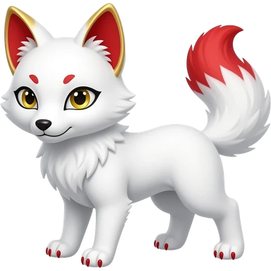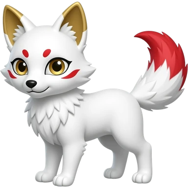 A pure white one-tailed kitsune (fox form,) with red accents, (one marking on each of its cheek, two markings each over its eyes and a single one on its forehead,) red on the insides of its ears, with gold markings inside of its ears,) and pale golden eyes. Pure white paws and a red tail tip. emoji