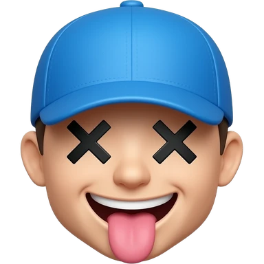 A grinning face emoji with X-shaped eyes, sticking out a long tongue, and wearing a bright blue baseball cap. The emoji should be in a standard, detailed 3D emoji style. Remove all screen-related elements like fingers, glare, or app icons." emoji