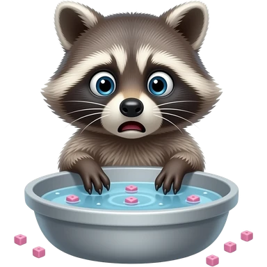 A confused raccoon looking at its empty paws in a bowl of water, shocked expression, floating bits of pink sugar, emoji style. emoji
