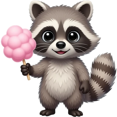 A cute, fluffy raccoon holding a big pink puff of cotton candy, emoji style emoji