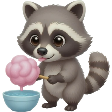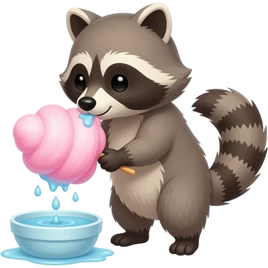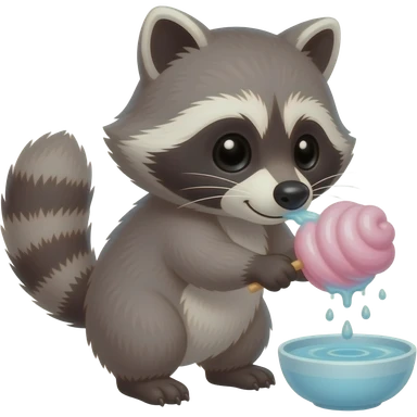 A cute raccoon dipping a pink cotton candy into a small bowl of water, washing motion, emoji style. emoji