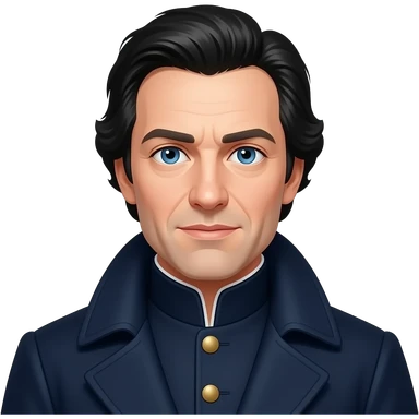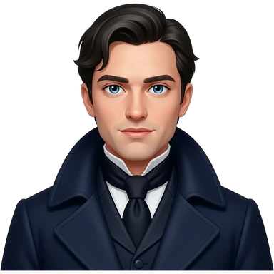 A Young Tall Mature looking Historical Duke of the North in his mid 20s, sharp facial features with very light skin, partial bangs and side slicked back jet black hair and piercing ocean blue sharp-eyes, wearing a sharp, dark navy formal uniform with a wooly collared coat. emoji