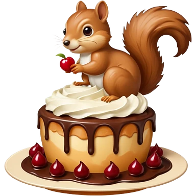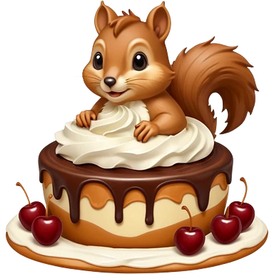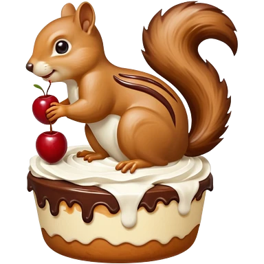 A large caramel custard decorated with chocolate and almonds to resemble a squirrel. Whipped cream with streaks of chocolate forms the shape of the squirrel's tail. It is topped with a cherry. emoji