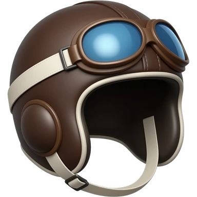 A sleek, dark brown leather aviator helmet. NO brim. A single large, clear, reflective blue-lensed pair of goggles with brown frames sits prominently on the top. Soft white straps. Minimalist shape, glossy finish emoji