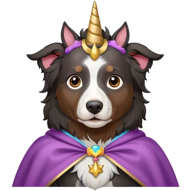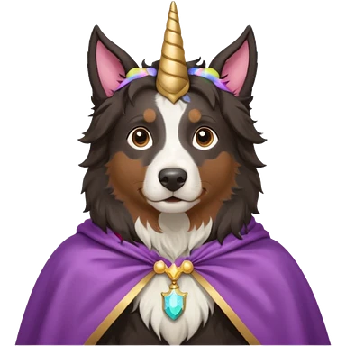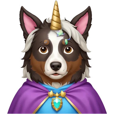 A autralian sheperd with a unicorn and a cape emoji