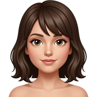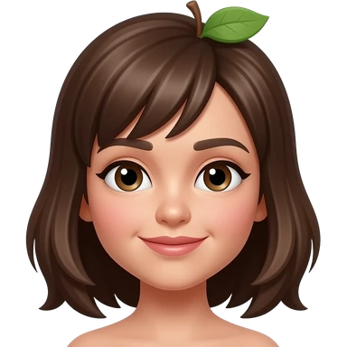 A brunette girl with hair on shoulders with side curtain bangs and a bit dark skin/tanned and is based on an apple emoji emoji